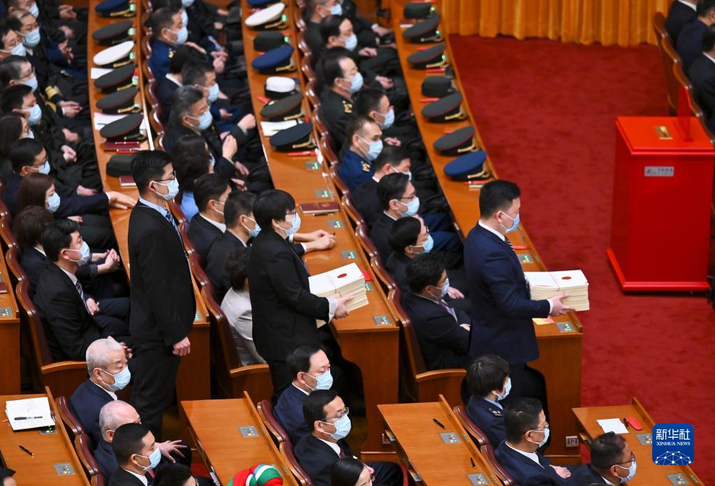 3月11日,十四屆全國人大一次會(huì)議在北京人民大會(huì)堂舉行第四次全體會(huì)議。這是工作人員準(zhǔn)備發(fā)放選票。