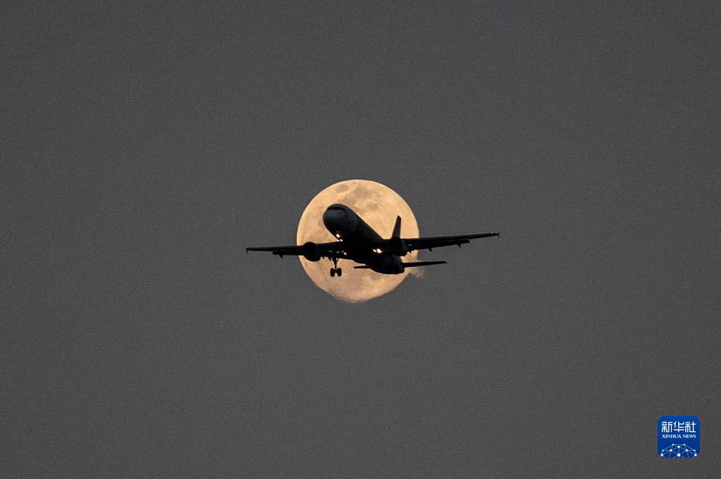 這是3月6日在印度新德里拍攝的飛機和月亮。