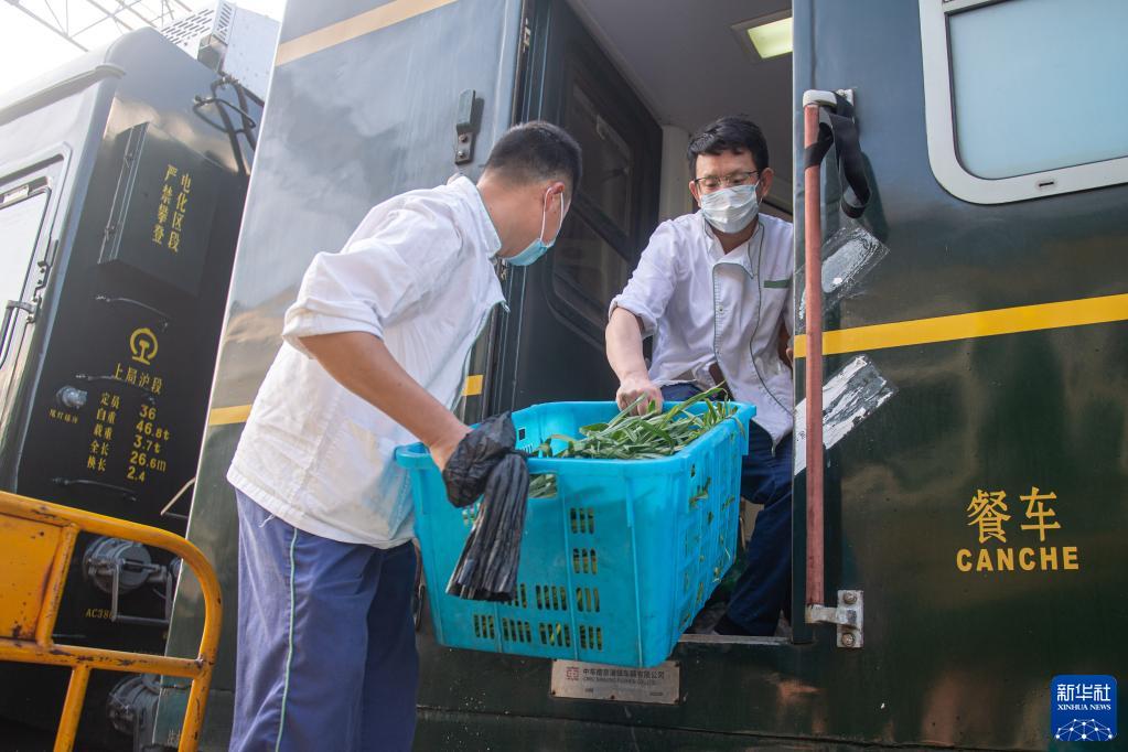 3月10日,杭州客運段的工作人員為Y71次旅游專列餐車備料。
