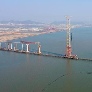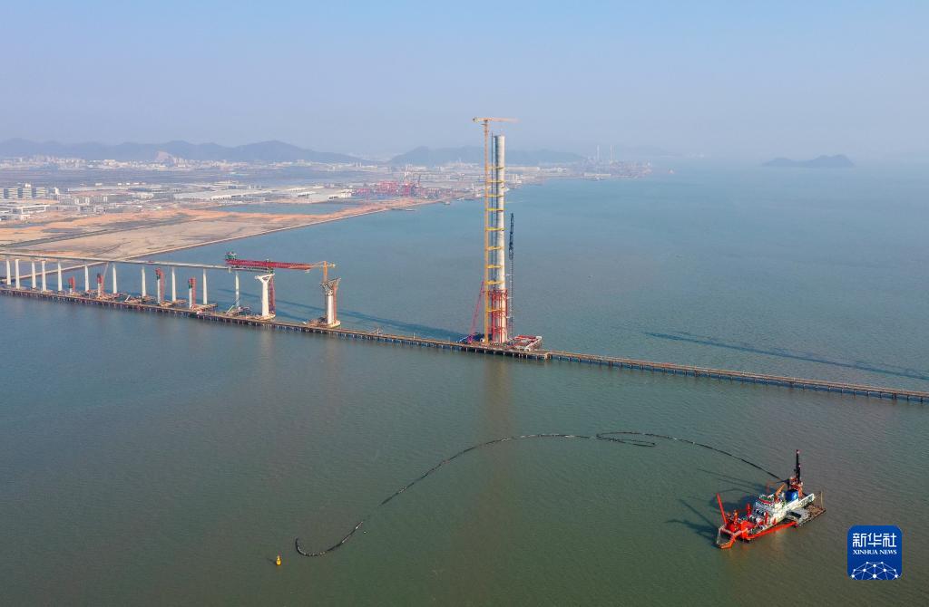 目前,黃茅海跨海通道高欄港大橋東主塔已經封頂、西主塔和黃茅海大橋三座主塔也臨近封頂,海上陸上基樁、承臺、墩柱、箱梁架設進展順利,長虹臥波的黃茅海跨海通道雛形初現。