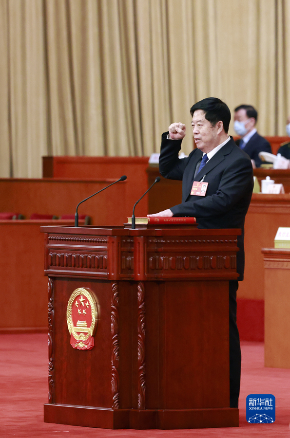3月11日,十四屆全國人大一次會議在北京人民大會堂舉行第四次全體會議。劉金國當選為中華人民共和國國家監察委員會主任。這是劉金國進行憲法宣誓。