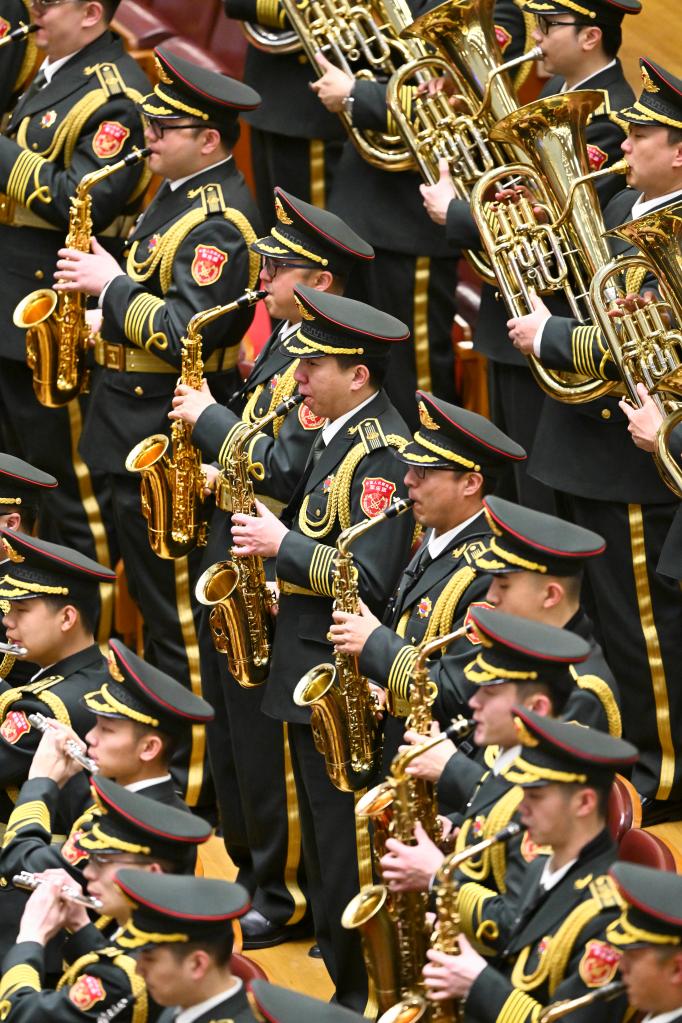 3月11日,中國人民政治協商會議第十四屆全國委員會第一次會議在北京人民大會堂舉行閉幕會。這是軍樂團在演奏。