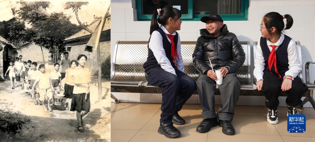 左圖:上世紀60年代,金沙小學五(2)雷鋒中隊隊員幫助軍烈屬打水(新華社發(fā));右圖:2月24日,金沙小學學生們和當?shù)鼐蠢显豪先肆奶欤ㄐ氯A社記者 季春鵬 攝)(拼版照片)。