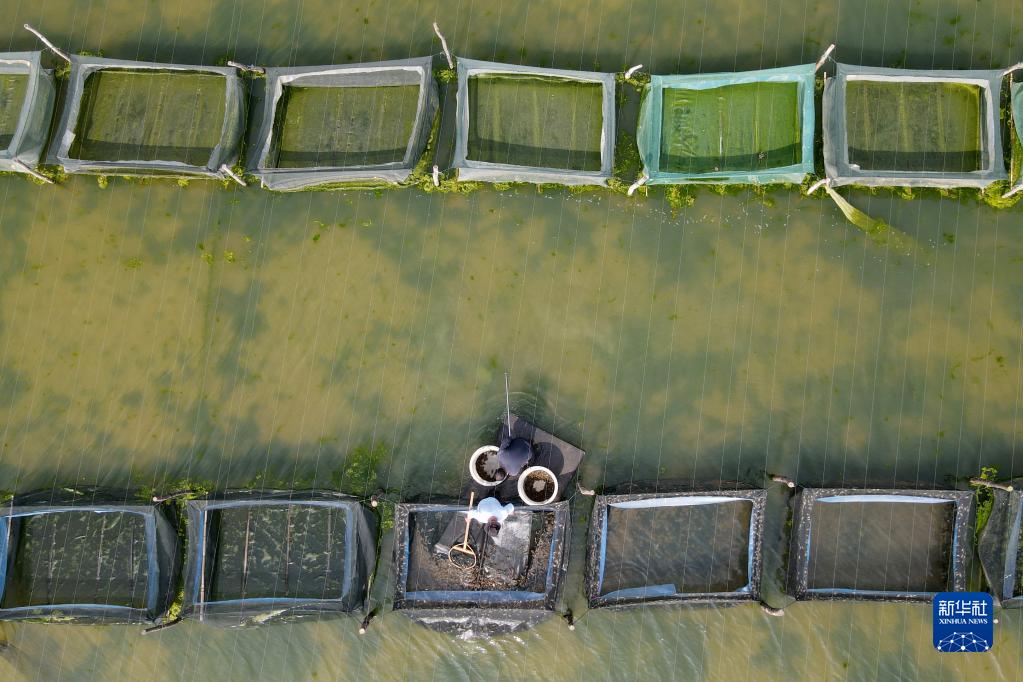 3月9日,在安徽省蚌埠市五河縣申集鎮(zhèn),蟹農(nóng)從網(wǎng)箱中撈出培育好的蟹苗(無人機(jī)照片)。
