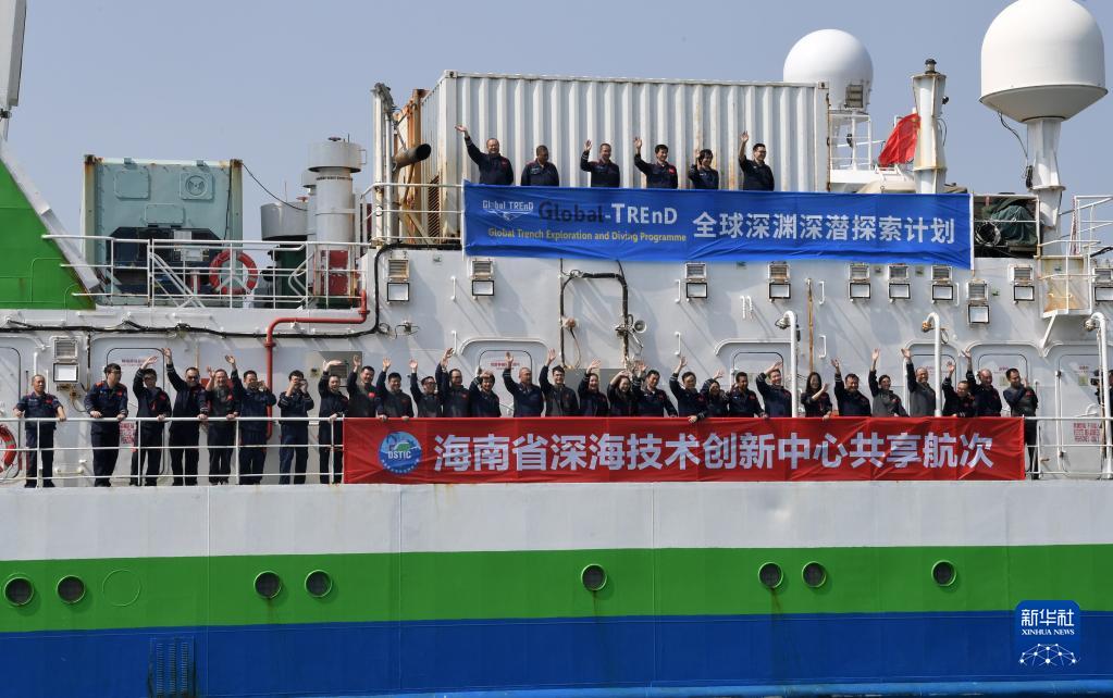 當日,“探索一號”科考船攜“奮斗者”號全海深載人潛水器抵達三亞,圓滿完成國際首次環大洋洲載人深潛科考航次任務。