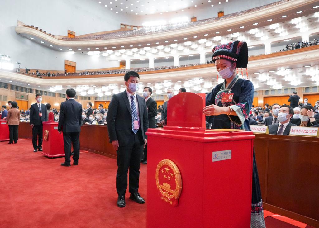 3月11日,十四屆全國(guó)人大一次會(huì)議在北京人民大會(huì)堂舉行第四次全體會(huì)議。這是代表在投票。