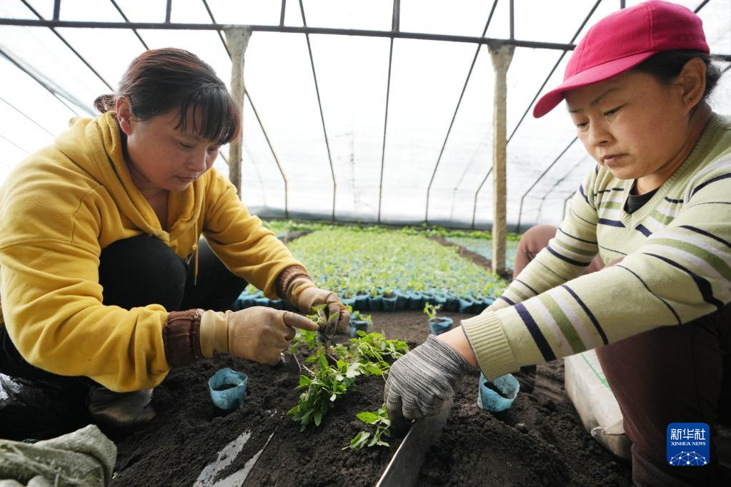 3月9日,在黑龍江省佳木斯市郊區長青鄉萬興村棚室內,村民在移栽西紅柿秧苗。