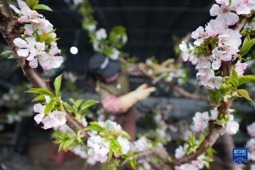 3月9日,在黑龍江省佳木斯市郊區現代農業產業園區棚室內,工作人員在給櫻桃樹人工授粉。
