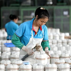 3月21日,在德化一家陶瓷企業生產車間,工人給陶瓷空心注漿。
