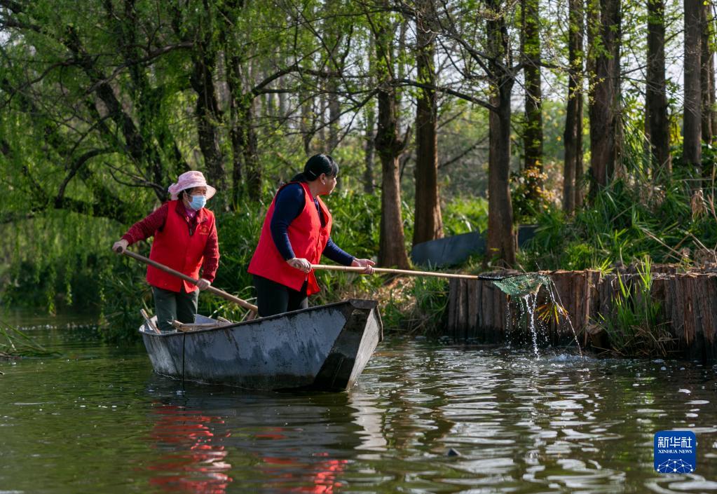 3月20日,李云麗(右)和隊員在滇池草海水域打撈枯枝落葉等。
