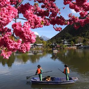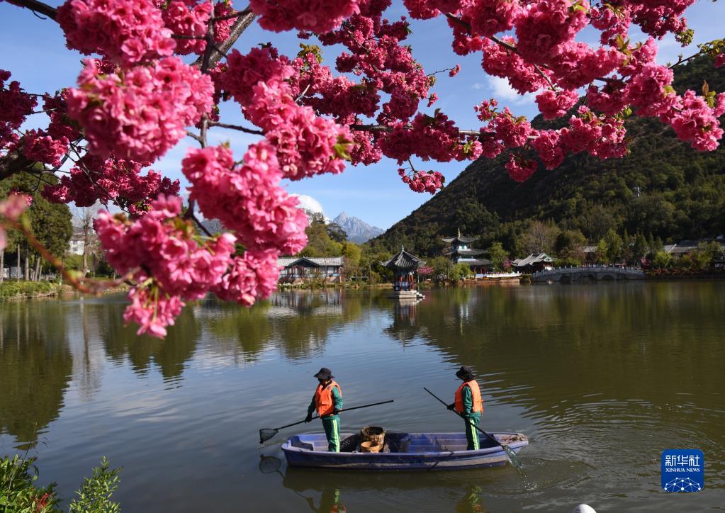 3月22日,在云南省麗江市古城區(qū)黑龍?zhí)豆珗@,環(huán)衛(wèi)工人在打撈水面垃圾。