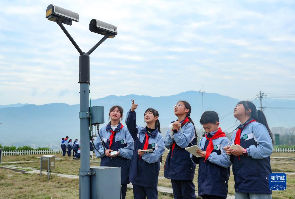 3月21日,四川省華鎣市紅巖小學的學生在氣象站參觀氣象設備。