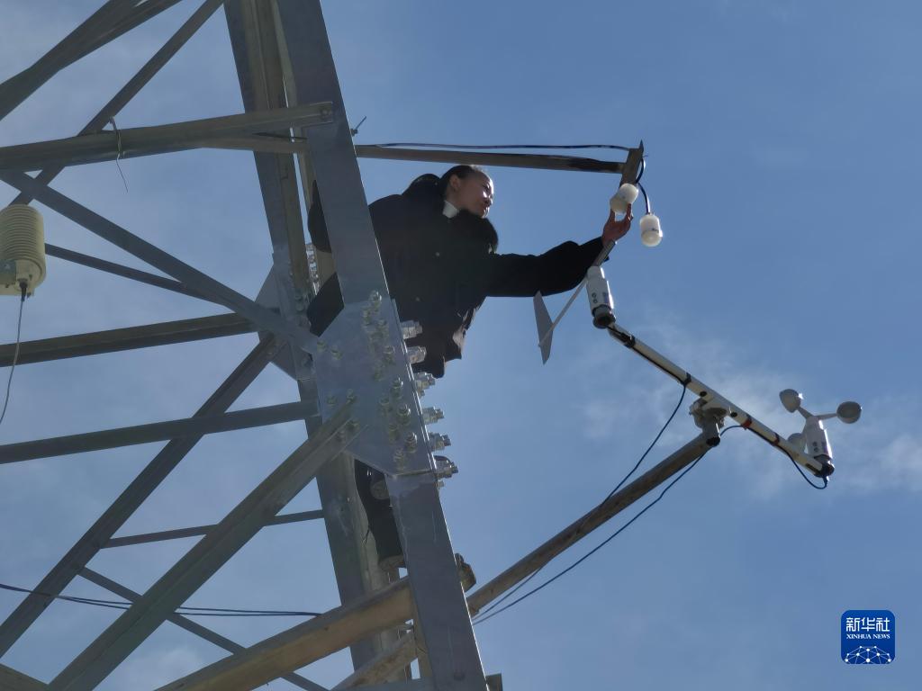 工作人員彭小清在香格里拉國家大氣本底站巡查鐵塔溫室氣體10米進氣口(3月9日攝)。