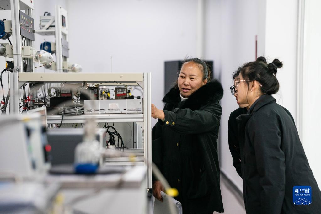 工作人員彭小清(左)和李曉莉(中)、殷鉞淼在香格里拉國家大氣本底站大氣成分業(yè)務用房巡視溫室氣體氣相色譜儀(3月9日攝)。