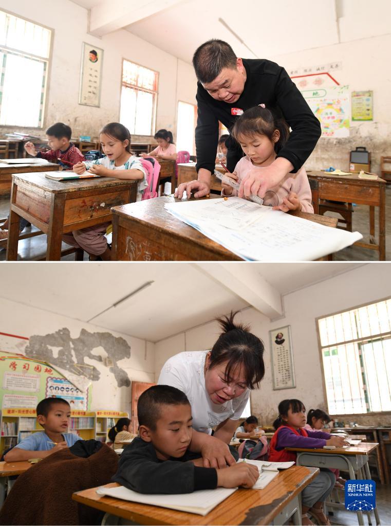 這是一張拼版照片:在廣西德保縣東凌鎮(zhèn)那王小學(xué),黃永勇(上圖)和黃秀碧(下圖)在課堂上輔導(dǎo)學(xué)生功課(3月22日攝)。