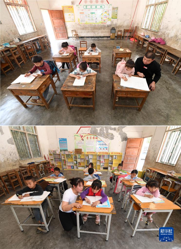 這是一張拼版照片:在廣西德??h東凌鎮那王小學,黃永勇(上圖)和黃秀碧(下圖)在課堂上輔導學生功課(3月22日攝)。