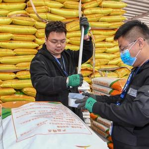 3月23日,在吉林省四平市梨樹縣一家農資生產企業,梨樹縣市場監督管理局工作人員(左一)聯合第三方檢驗機構對企業生產的產品進行抽樣檢驗。