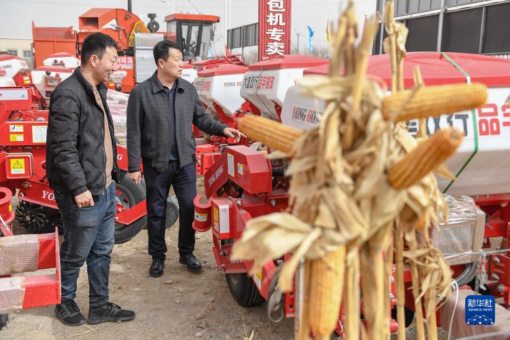 3月23日,在吉林省四平市梨樹縣一家農機銷售公司,梨樹縣農機推廣總站站長張志剛(右)向經銷商詢問農機銷售情況。
