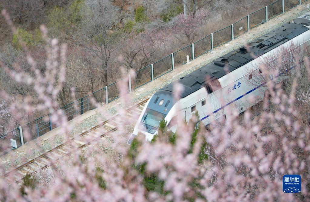 近日,北京居庸關長城腳下山花漸次開放。北京市郊鐵路S2線列車穿行于花海間,成為春日里一道美麗的風景。