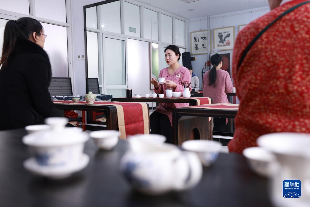 3月23日,群眾在內(nèi)丘縣文化館學(xué)習(xí)茶藝。
