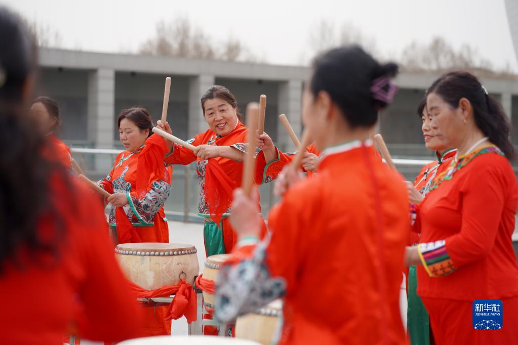 3月23日,群眾在內(nèi)丘縣邢窯博物館廣場學(xué)習(xí)慶源排鼓。