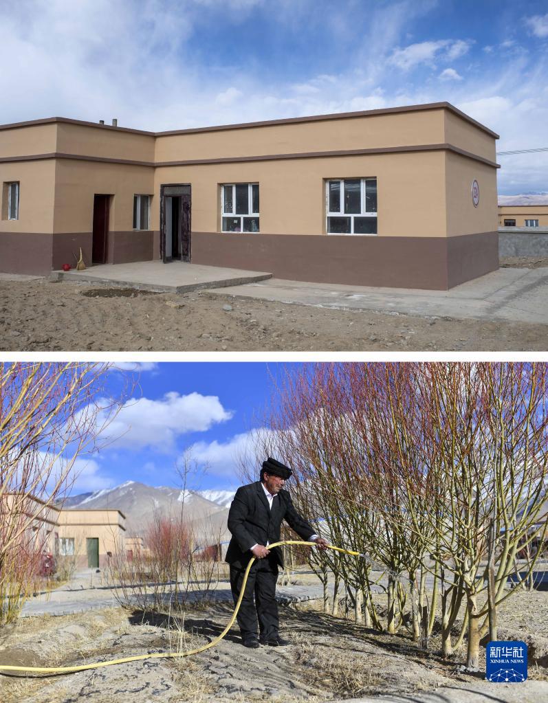 這是一張拼版照片,上圖為都熱·加爾曼剛搬遷至新家時的新居外景和門前小院(2018年11月18日攝);下圖為都熱·加爾曼在門前小院內給高原柳澆水(2023年3月21日攝)。經過播撒草籽、種樹,都熱家的小院已變了模樣。