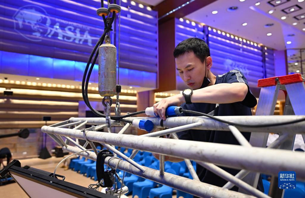 3月24日,工作人員在博鰲亞洲論壇國際會議中心檢查主會場設備。