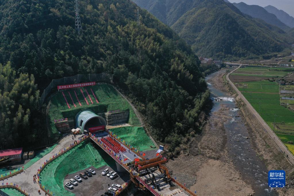 這是杭溫鐵路木匪嶺隧道進口(3月26日攝,無人機照片)。
