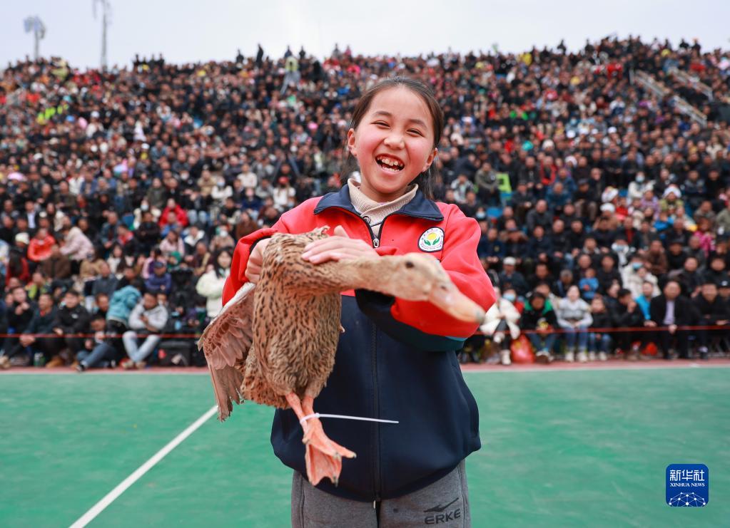 3月26日,當地小學生李文文在賽前投籃游戲中獲得鴨子作為獎品。