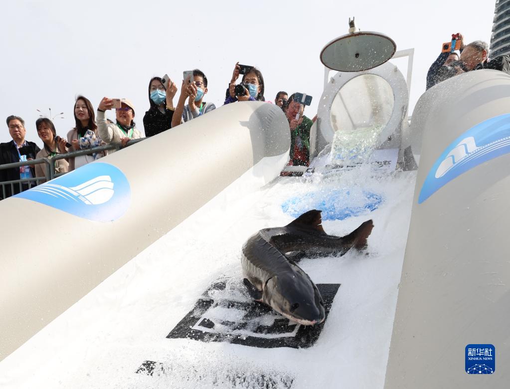 3月26日,人們在活動現場放流中華鱘。