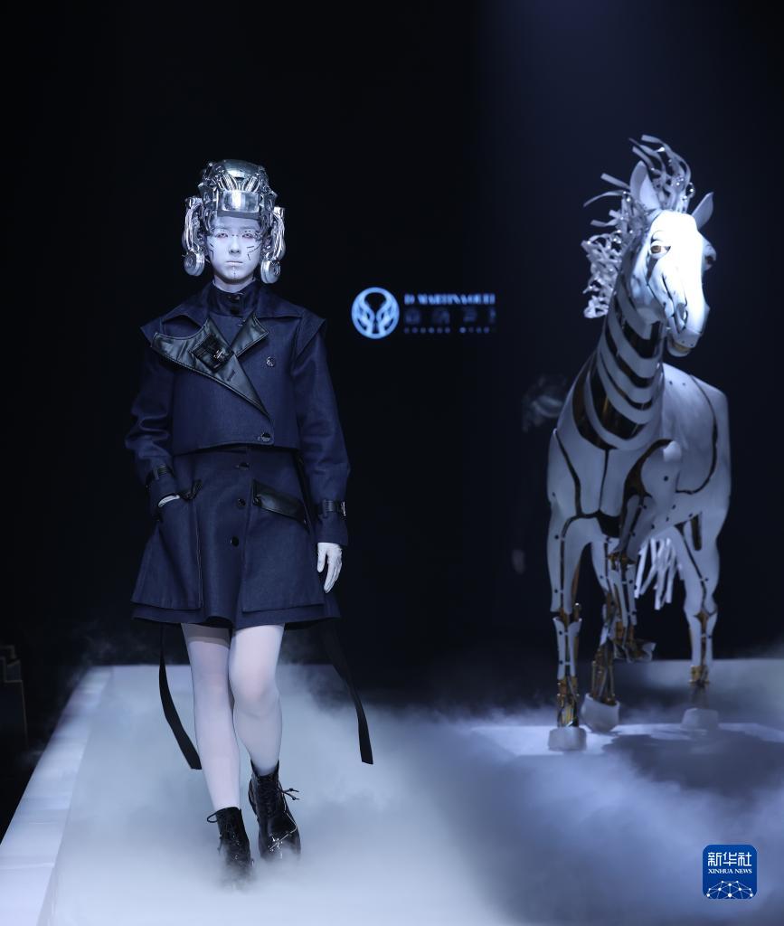 當日,主題為“視界·邊界”的時裝秀在北京舉行的中國國際時裝周2023秋冬系列上上演。設計師丁潔以婦好鸮尊為設計靈感,模特佩戴3D打印發飾,繞行秀場特別設置的“戰馬”,上演了一場歷史與未來“時空對話”的時裝秀。