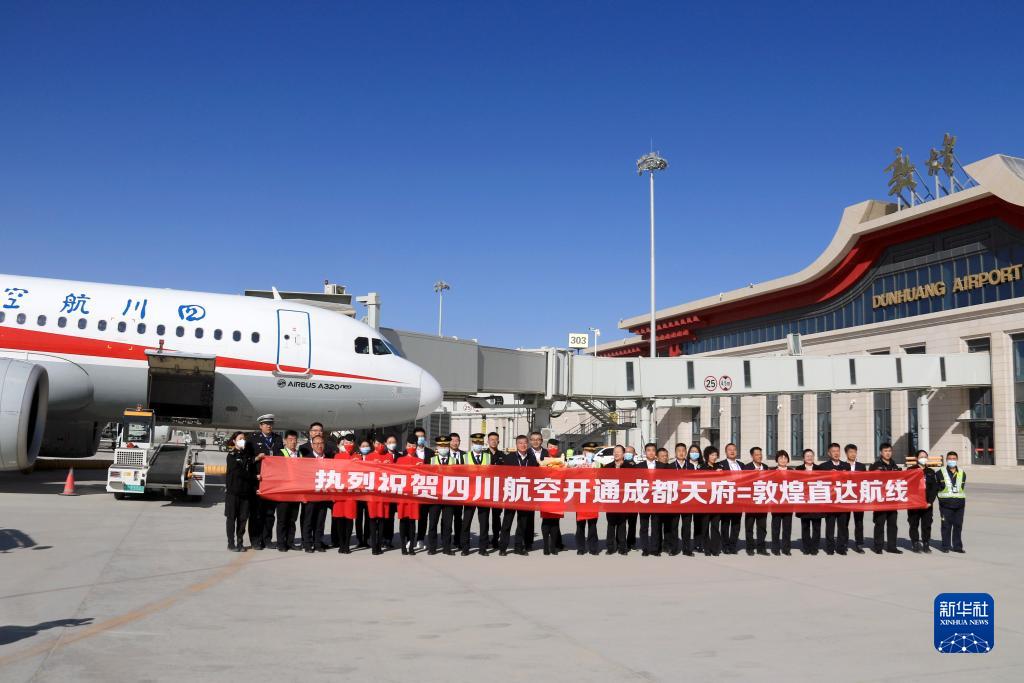 3月26日,由四川航空公司執(zhí)飛的成都至敦煌往返直達(dá)航線正式通航。這是首航航班機組人員與機場工作人員在甘肅敦煌莫高國際機場合影。