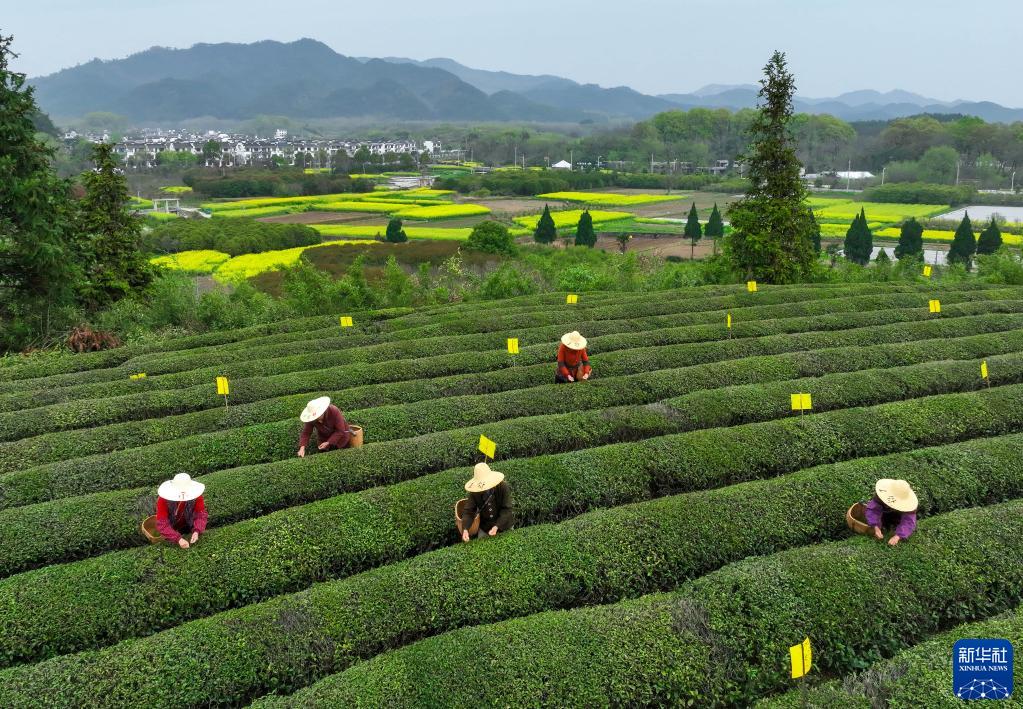 3月27日,茶農在安徽省黃山市徽州區潛口鎮坤沙村采摘黃山毛峰鮮葉(無人機照片)。