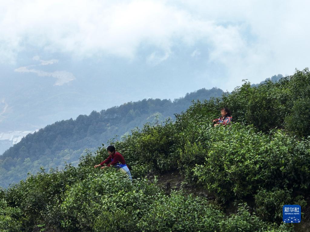 3月27日,在重慶市北碚區(qū)天府鎮(zhèn)文星村茶園,茶農(nóng)在采茶(無人機照片)。