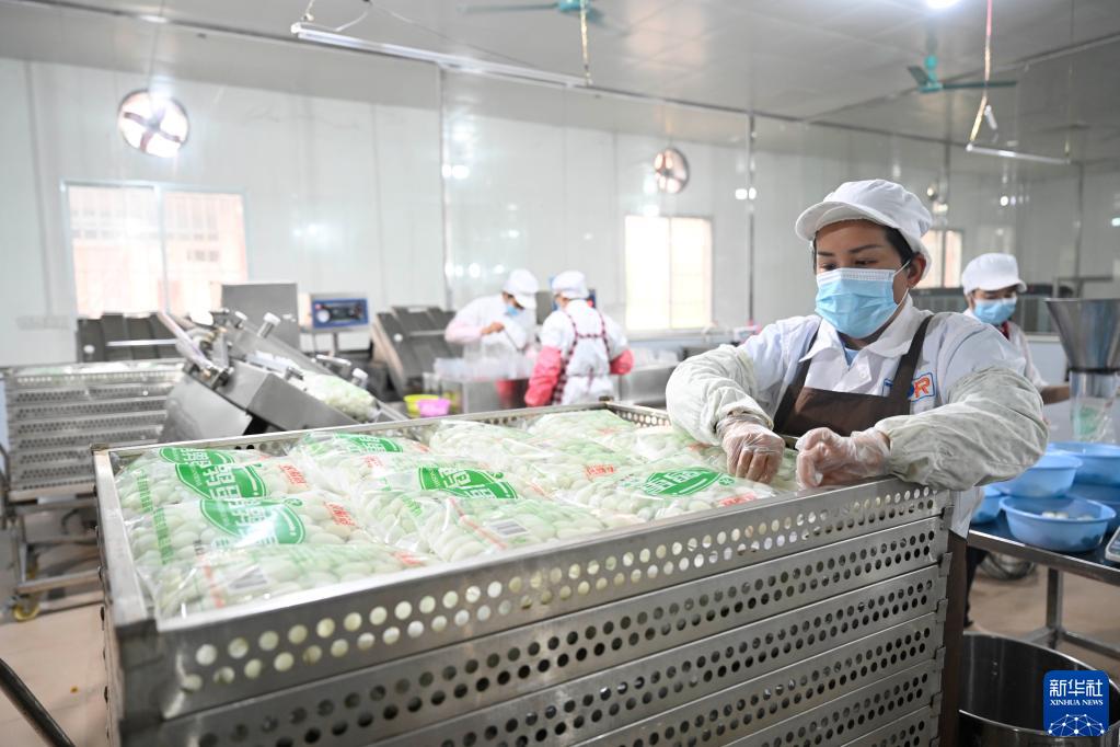 3月27日,在柳州市柳城縣社沖鄉(xiāng)柳州螺螄粉原材料基地里,工人在鵪鶉蛋加工廠車間里忙碌。