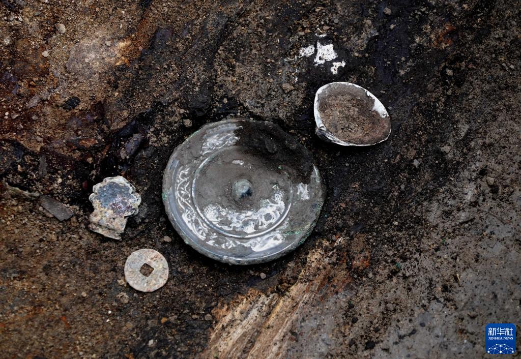 這是宋國故城遺址內(nèi)的唐代墓葬出土的銅錢、銅鏡等(3月25日攝)。新華社記者 李安 攝