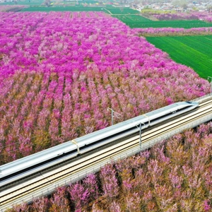 3月27日,高鐵列車從許昌市建安區小召鄉紫荊花海中駛過(無人機照片)。
