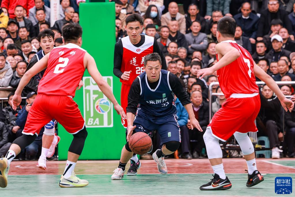 3月27日,黔東南州代表隊(duì)球員歐明輝(右二)在比賽中進(jìn)攻。