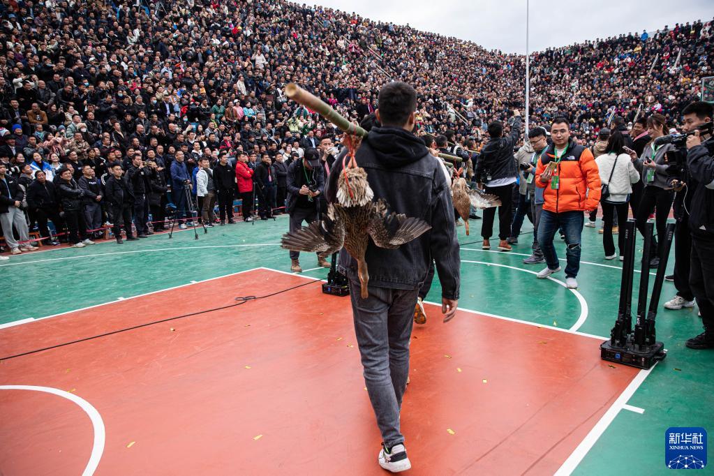 3月27日,工作人員挑著當地農特產品“三穗麻鴨”進入賽場。這是季軍銅仁市代表隊的獎品。