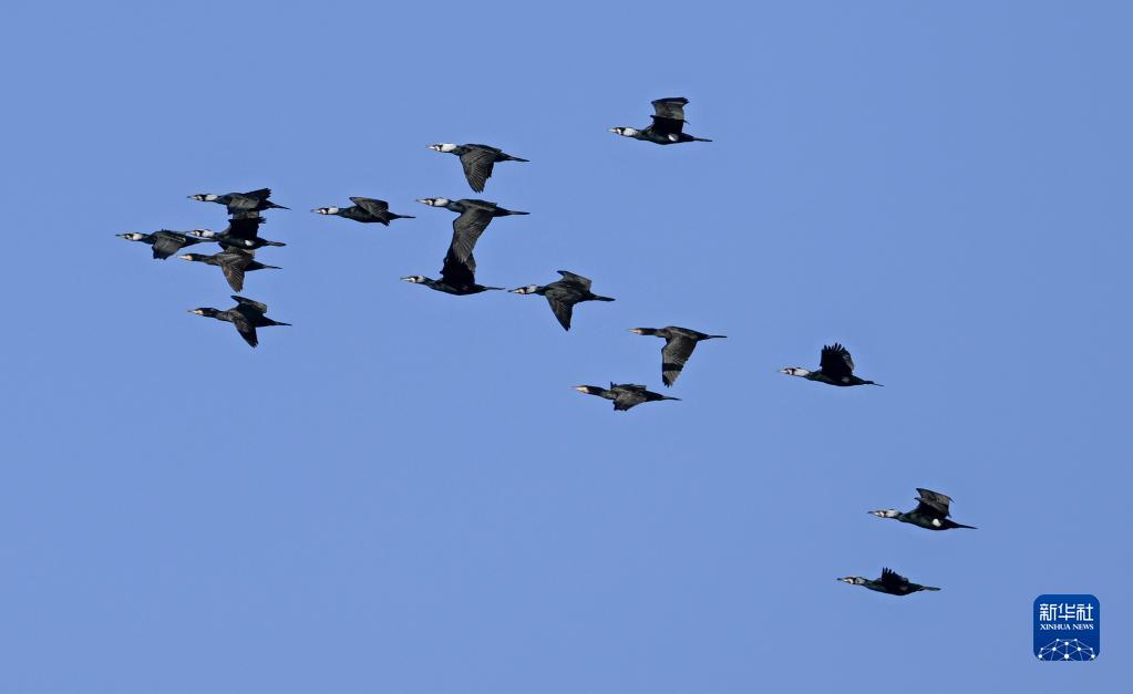 3月27日,一群鸕鶿在孟家段國家濕地公園飛翔。