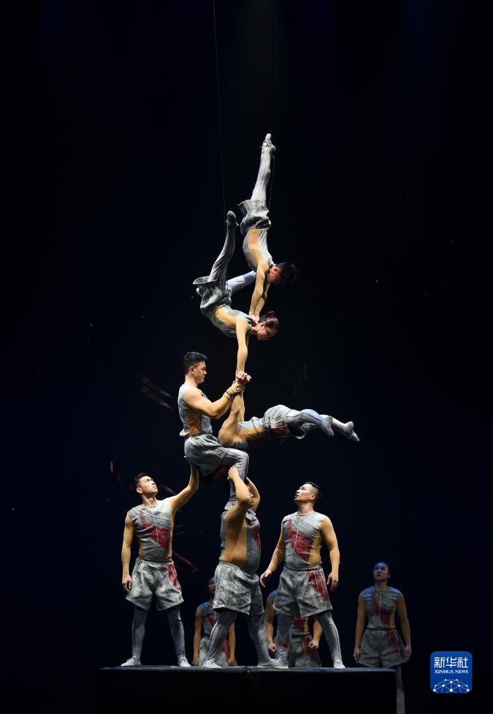 3月27日晚,在位于山東省濟南市的山東劇院,演員表演雜技節目《無形·倒立技巧》。