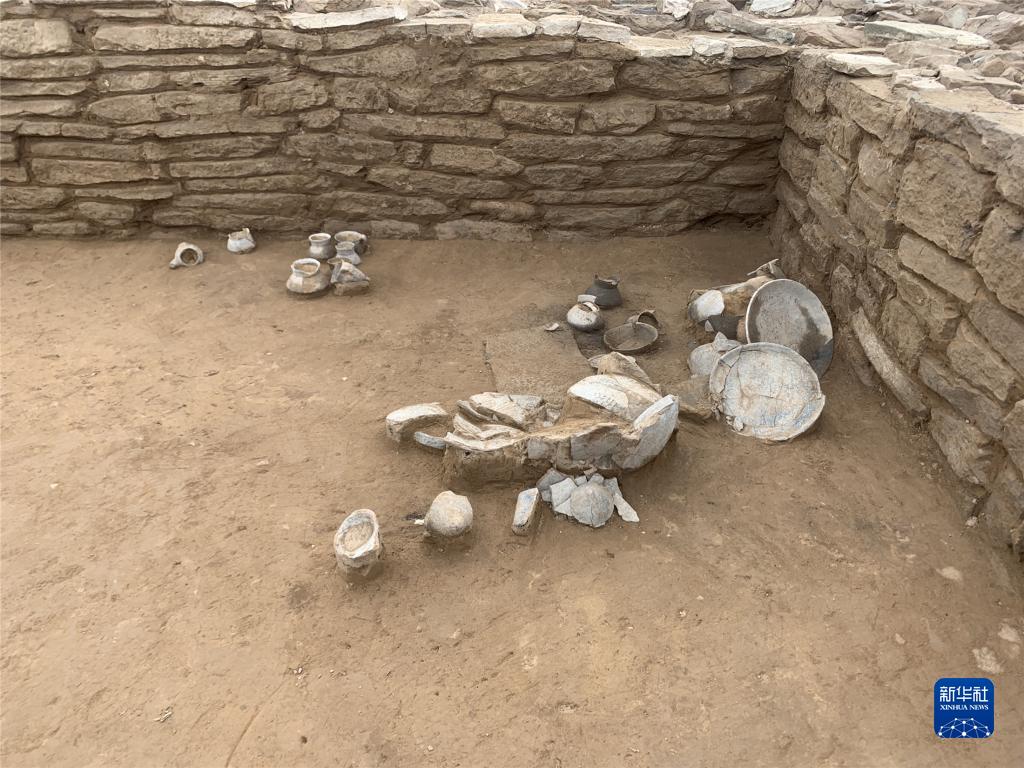 山西興縣碧村遺址甕城墻角出土的條石及周邊器物組合(資料照片)。