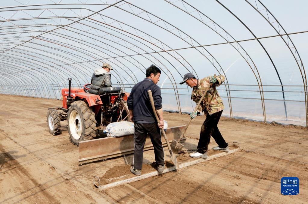 在海林市海林鎮新合村水稻育秧示范基地,工作人員在水稻育秧大棚中平整土地(3月27日攝)。