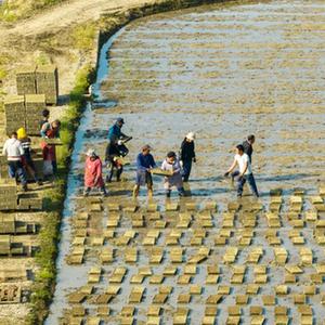 3月28日,在浙江省余姚市黃家埠鎮(zhèn)上塘村,農(nóng)民在稻田里擺放早稻機(jī)插秧盤(無人機(jī)照片)。
