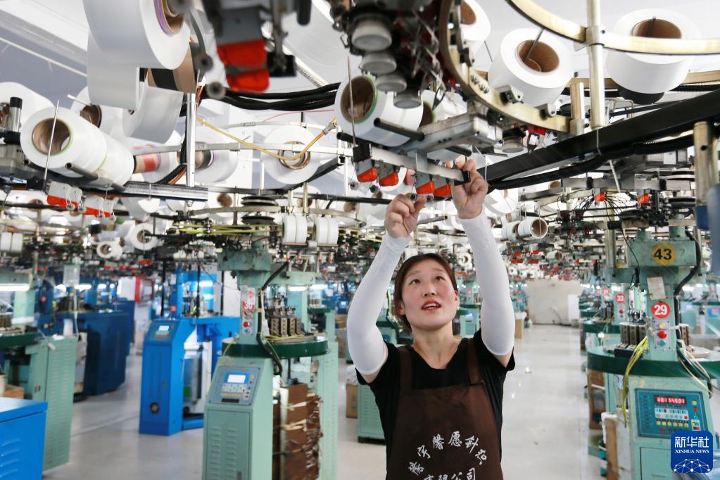 3月28日,在淮北市杜集區石臺鎮農民工創業園,一家針織企業的工人在織襪車間作業。