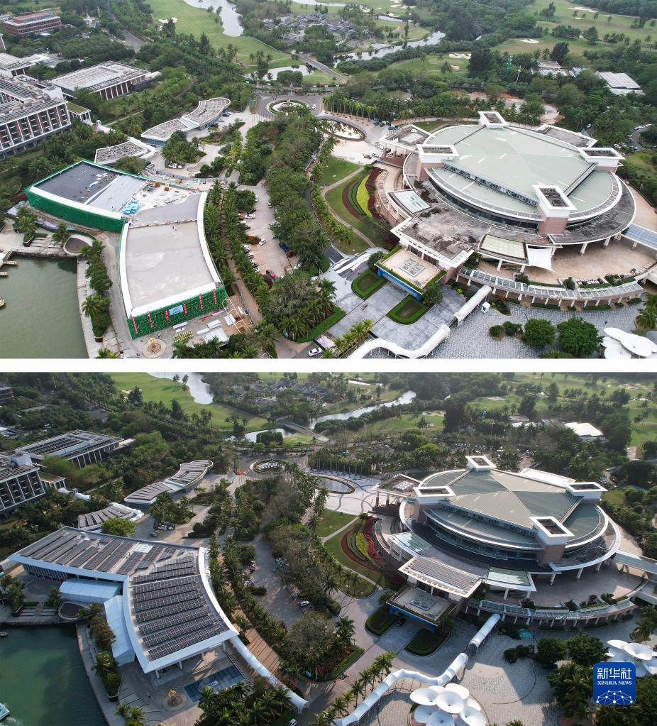 這是一張拼版照片:上圖為博鰲零碳示范區內改造前的博鰲亞洲論壇國際會議中心(右)和博鰲亞洲論壇新聞中心(1月12日攝,無人機照片);下圖為改造后的博鰲亞洲論壇國際會議中心和博鰲亞洲論壇新聞中心(3月14日攝,無人機照片)。