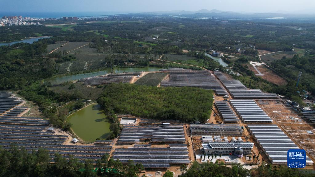 航拍位于博鰲鎮(zhèn)東嶼島外的農(nóng)光互補(bǔ)發(fā)電項(xiàng)目(3月14日攝,無人機(jī)照片)。