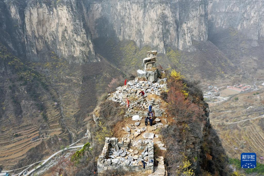 在山西省壺關縣大峽谷鎮青龍峽村,村民們在搬運石頭(3月23日攝,無人機照片)。新華社記者 詹彥 攝