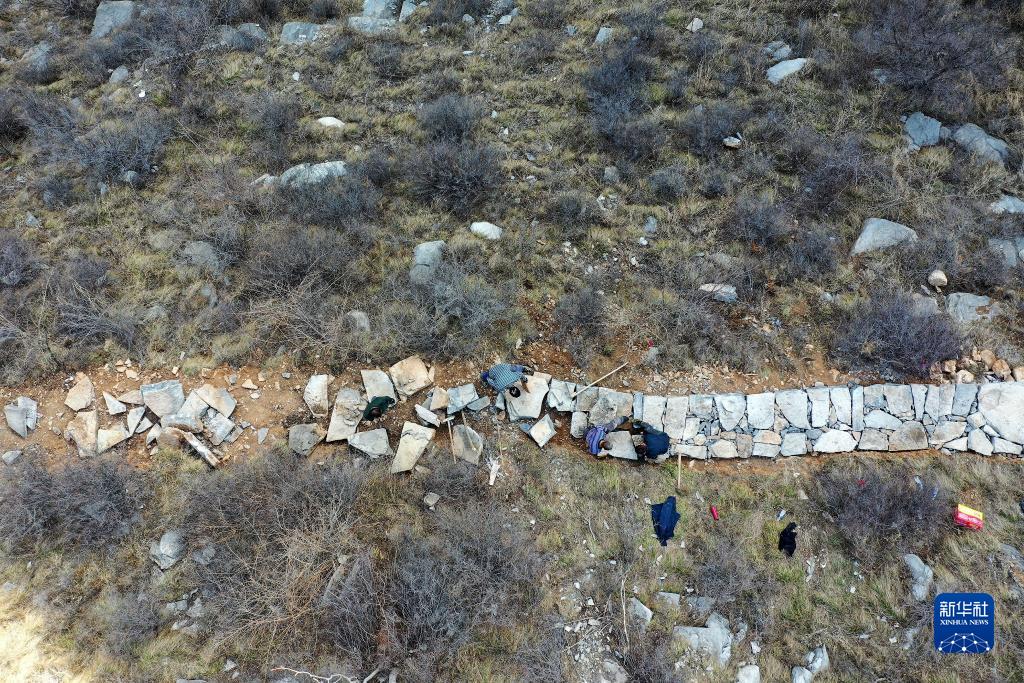 在山西省壺關(guān)縣大峽谷鎮(zhèn)青龍峽村,村民們在山上修路(3月7日攝,無人機(jī)照片)。新華社記者 詹彥 攝