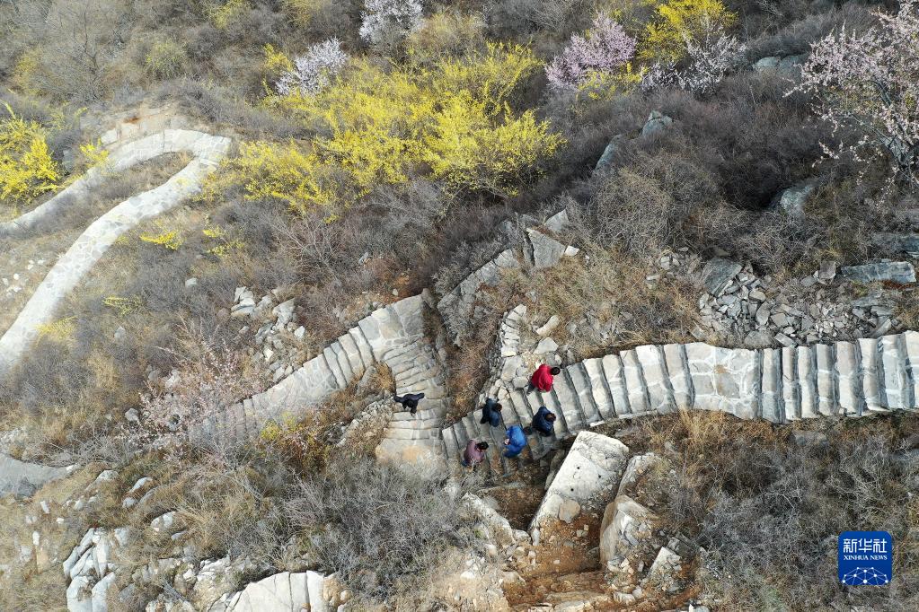 在壺關縣大峽谷鎮(zhèn)青龍峽村,村民們走在修好的旅游步道上(2023年3月23日攝,無人機照片)。新華社記者 詹彥 攝